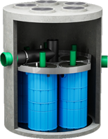 In der Mitte des Reinigungsschachtes befinden sich vier Filterelemente. Mit diesen werden im Aufstromverfahren die Feinstoffe gefiltert und ein Großteil der gelösten Schadstoffe adsorptiv gebunden. Der Filter ist von oben rückspülbar und im Falle einer völligen Verschlämmung leicht austauschbar.