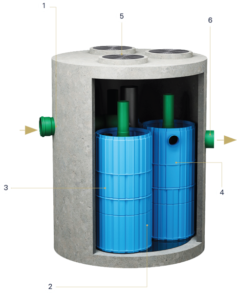 Über den Filterelementen befindet sich das saubere Wasser, es passiert eine Ölsperre und fließt dann über den Ablauf in die Versickerung oder ein Oberflächengewässer.