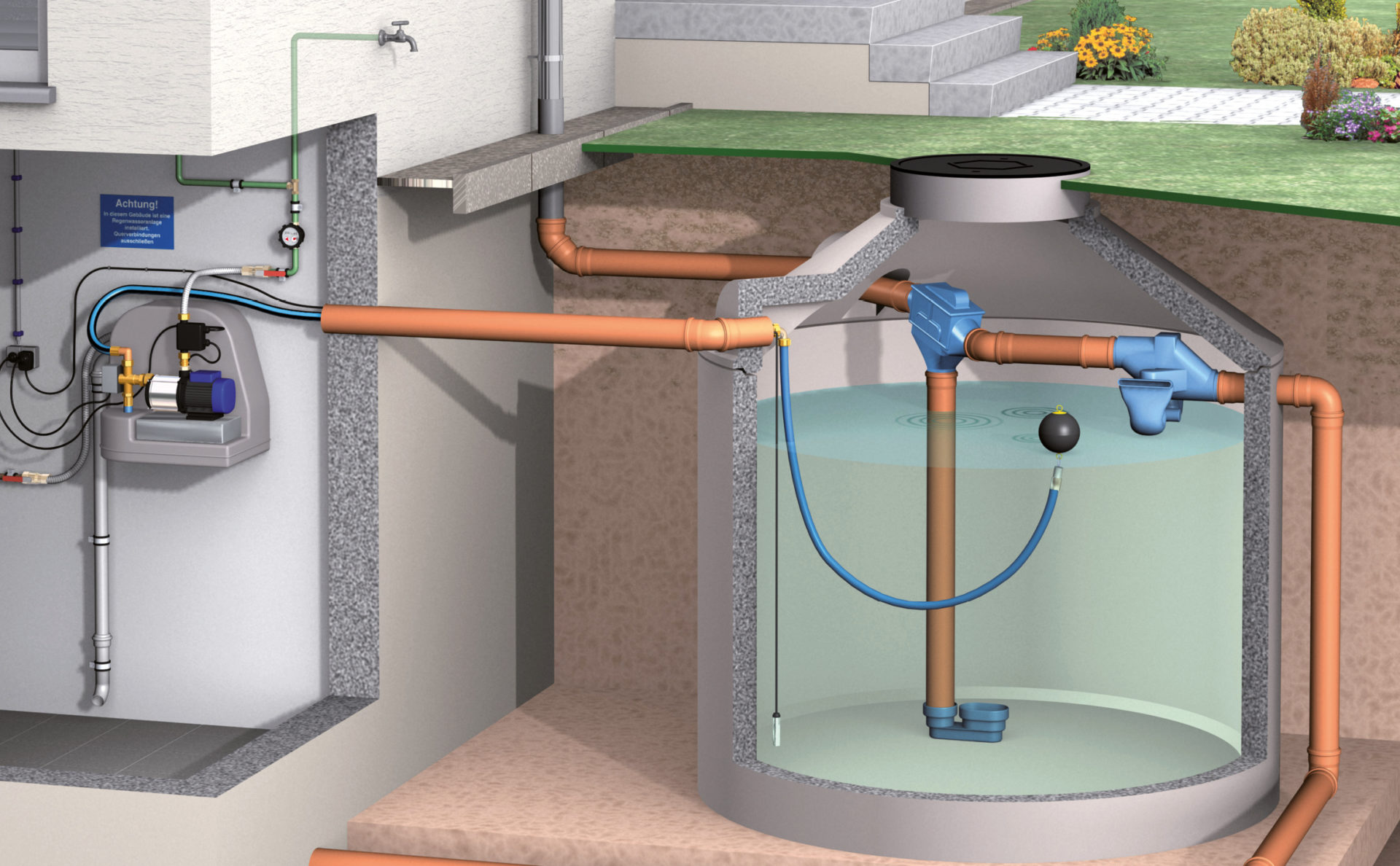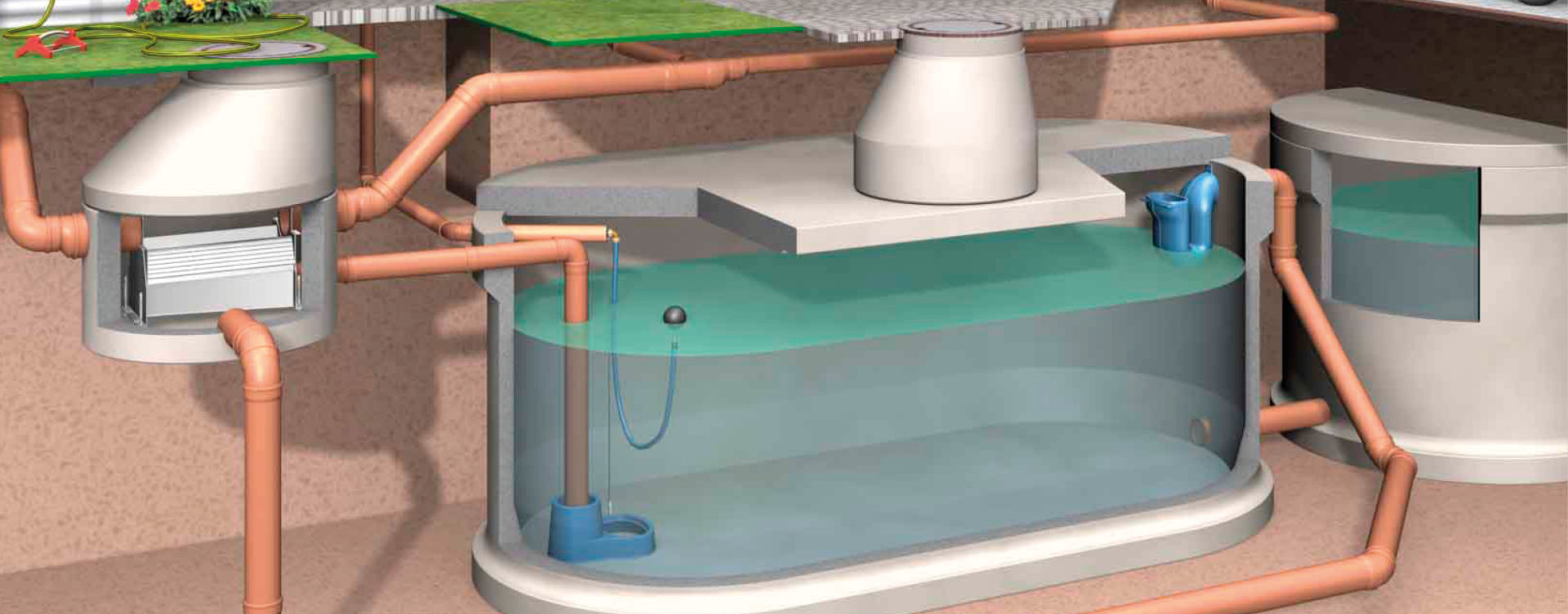 Diese Schwimmschicht wird beim Überlaufen der Zisterne durch den speziell geformten Überlaufsiphon mit Skimmereffekt entfernt.