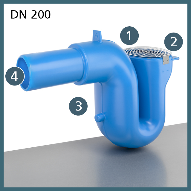 Zulauf mit Nagetiersperre Ösen für die Aufhängung Anschluss-Stutzen DN 50, um ein HT-Rohr als Stützrohr zu nutzen Ablauf DN 200 / DN 250