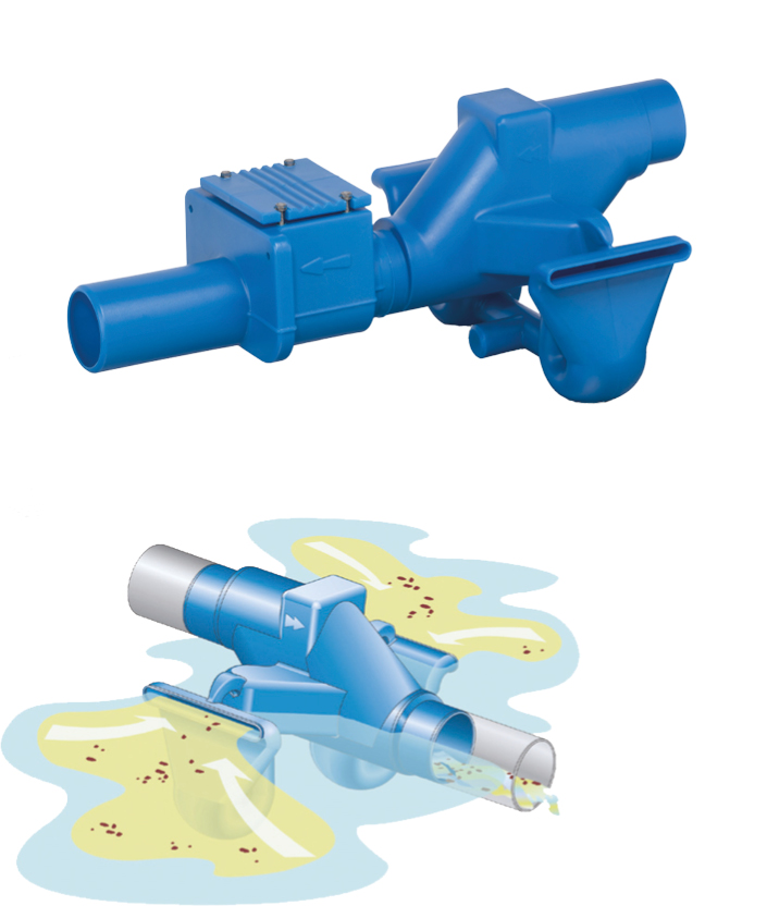 Eigenschaften wie die 3P Rückstauklappe DN 100 ( S.146), zusätzlich mit speziellem Überlaufsiphon UNO, Überlauf mit Geruchsverschluss und Absaugung des Oberflächenwassers.