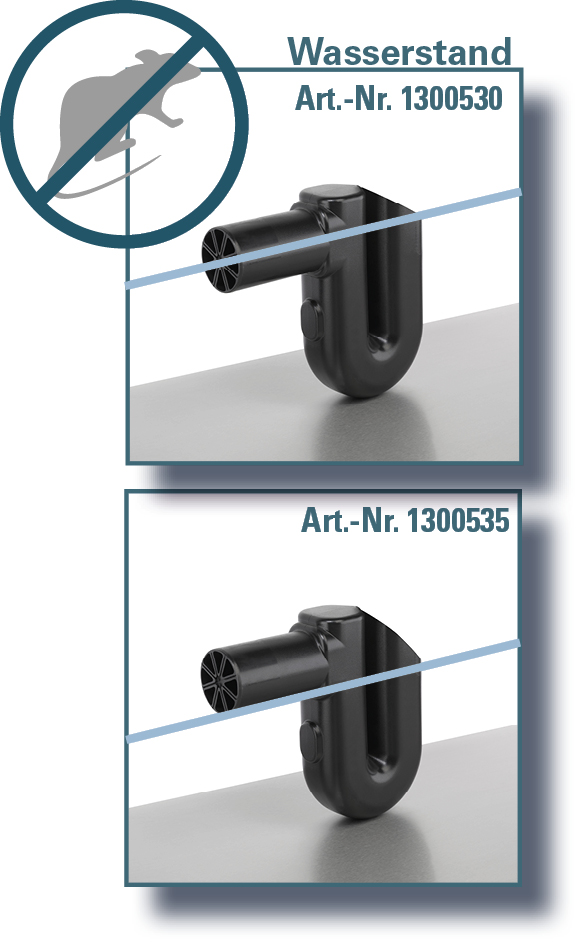 Überlaufsiphon mit einer beidseitigen Abschnorchelung des Oberflächenwassers im Regenwasserspeicher, kein Durchkommen für Nagetiere.