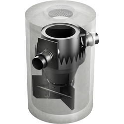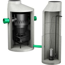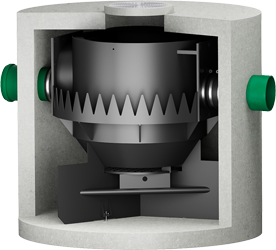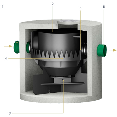 Das Wasser strömt tangential in der Mitte des hydrodynamischen Abscheiders ein.