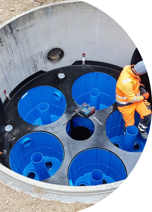 Die Reinigungsleistung ist so ausgelegt, dass die Anforderungen von M 153, dem DWA-A 102 und dem Trennerlass NRW sicher eingehalten werden. Eine Sedimentationsanlage Hydroshark DN 1.500 kam ebenfalls für geringer belastete Flächen als Vorbehandlung zum Einsatz. Auch hier wurde die gesamte Filtereinheit vor Ort in den Betonschacht gesetzt und installiert.